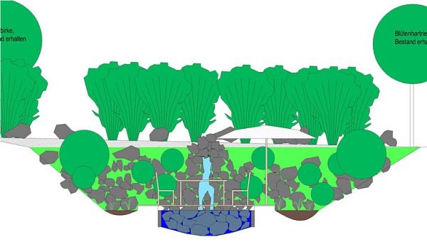 An warmen Tagen bietet die Holzterrasse einen angenehmen Aufenthalt in direkter Nähe des naturnahen Wasserspiels.