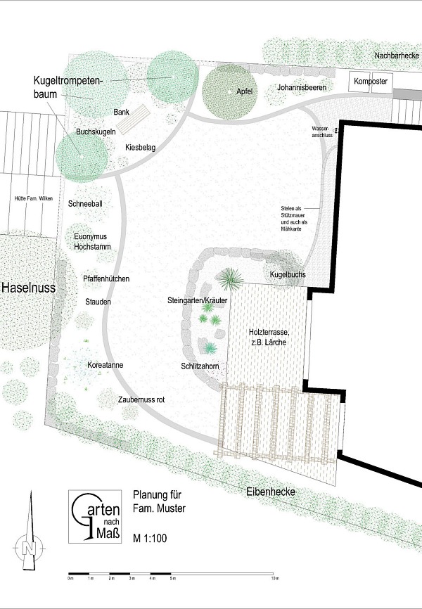 Dieser Entwurf beinhaltet lediglich eine sauber abgegrenzte Rasenfläche,die von Kräuterbeet, Obstgarten, zwei verschiedenen Sitzbereichen undBlühsträuchern als Sichtschutz umgeben ist.