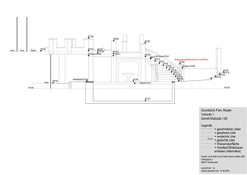 Wunsch des Bauherrn war eine Pool-Anlage mit mediterranem Charakter in seinem Garten. Vom Wohnzimmer im OG sollte die Anlage über den Balkon erreichbar sein. Dazu war es nötig geworden, eine Treppe zu entwerfen, die gestalterisch zur Architektur des Hauses passt und gleichzeitig dem Mediterranen des Gartens gerecht wird.
