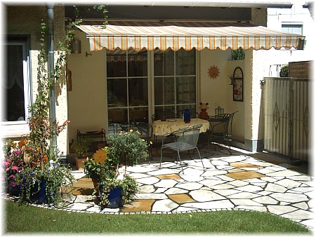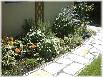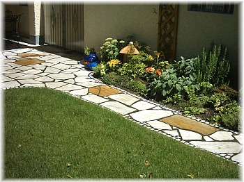 Hiervon gibt’s leider kein „Vorherbild“. Die Terrassenfläche wurde vergrößert und ein Weg führt am Kräuterbeet vorbei zum hinteren Teil des Gartens.