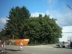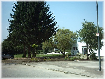 Einige wenige ausgewählte Gehölze, wie die schöne Weide im Hintergrund, wurden freigestellt, die Fichten aufgeastet und ein Großteil verwilderter Gehölze gefällt und wiederverwertet. Das anfallende Schnittgut wurde gehäckselt und diente als Mulchmaterial. Inzwischen zieren ein locker bepflanzter Pflanzstreifen und eine kleine Rasenfläche den Eingangsbereich der Anlage.